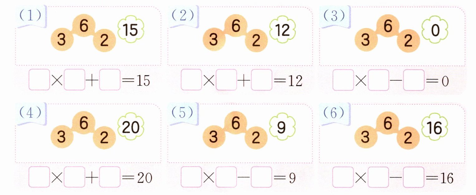 (6) 3 6 2(或6 3 2)解析 乘加、乘减算式中先算乘法,再算加、减法。第一步 可以先思考哪两个数相乘的积接近结果。第二步 根据算式中第二步的运算确定这两个数。算式中第二步是加法,两个数相乘的积小于结果;第二步是减法,两个数相乘的积大于结果。第三步 代入算式进行确认。如结果是15,与2和6、3和6相乘的积接近,算式第二步是加法,所以这两个数相乘的积小于15,这两个数应该是2和6。代入算式确认,2×6+3=15(或6×2+3=15),算式成立。
