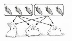 解析要让每只小兔分得同样多,就是把6根胡萝卜平均分成3份。动手分一分,如下图,每只小兔应分2根胡萝卜。