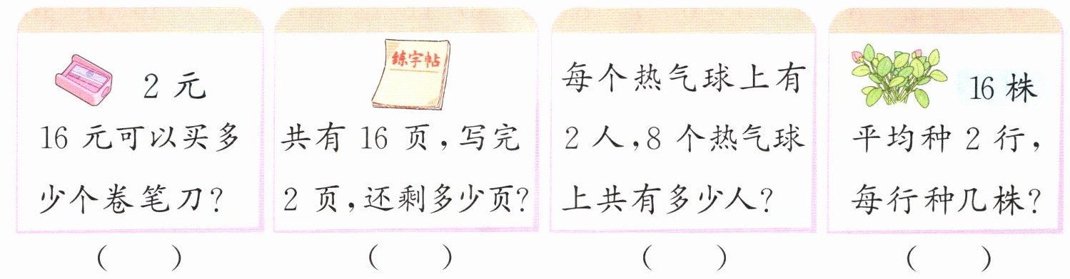 3 下面哪些问题能用16÷2解决?在( )里画“√”。