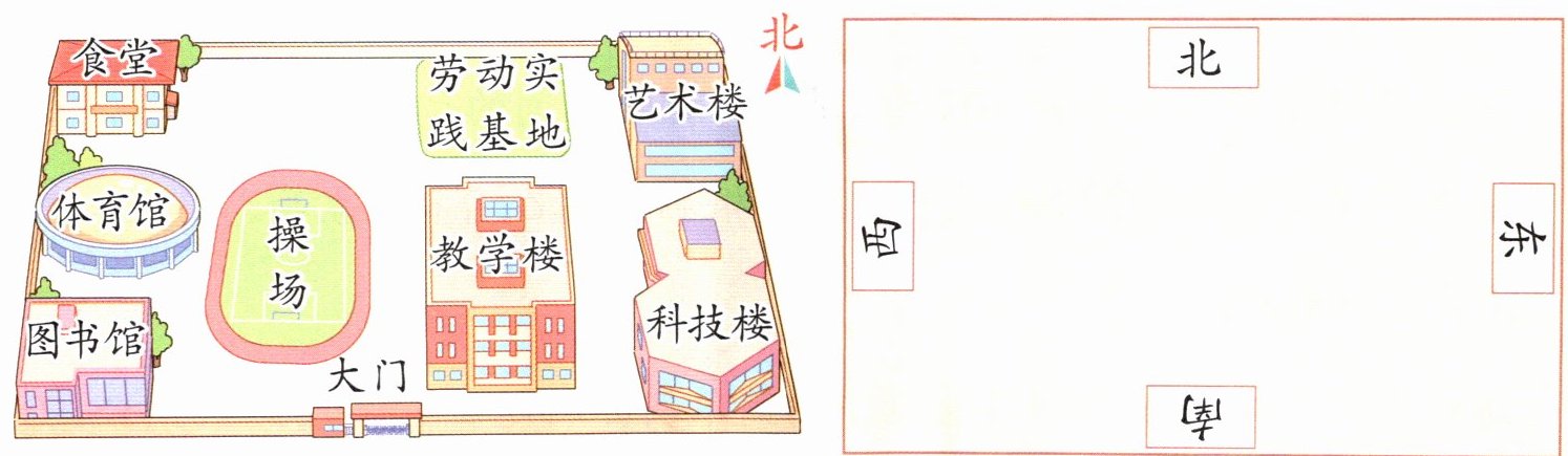 3妈妈想从大门出发,去艺术楼参加“书法展示活动”。请你在下面的方向牌上标出艺术楼的大致位置,并为妈妈设计一条路线。