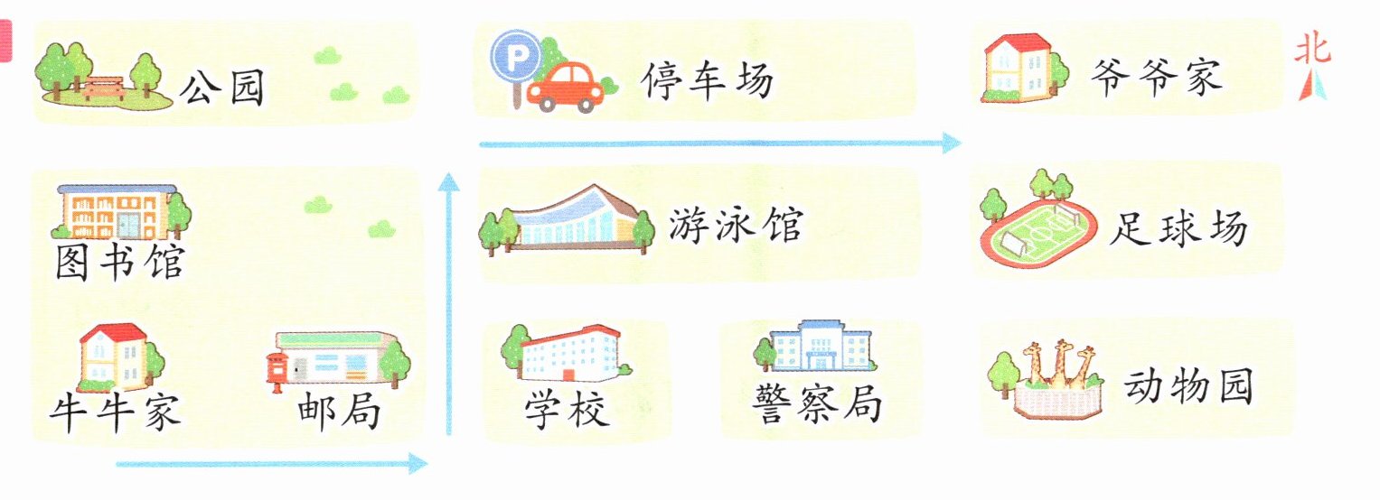 牛牛家$\xrightarrow{东}邮局\xrightarrow{( )}停车场\xrightarrow{( )}$爷爷家