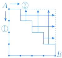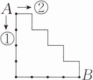 6 观察下图,从点A到点B有两条路线。哪条路线更长?表示出你的想法。(图中每小段的长度代表1厘米)