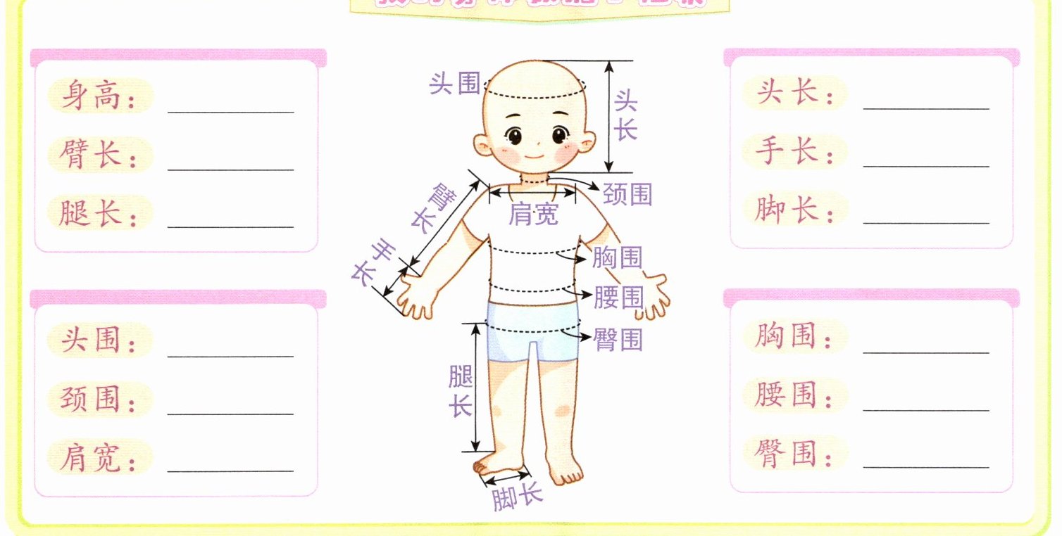 ★长度类(身高、臂长、腿长、头长等):可用软尺(如皮尺)、直尺(配合软绳辅助,先用软绳贴合部位量,再用直尺量软绳长度)测量。