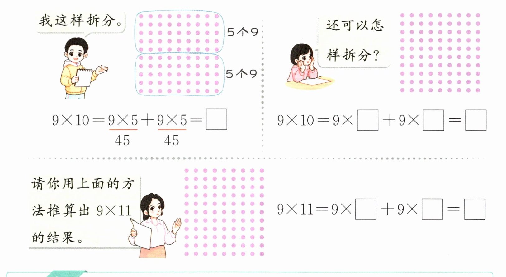解析 第一幅图,每行有9个点子,有10行,是10个9。把10个9分成5个9和5个9,分别算出每部分,再合起来就是10个9的和,也就是45+45=90。