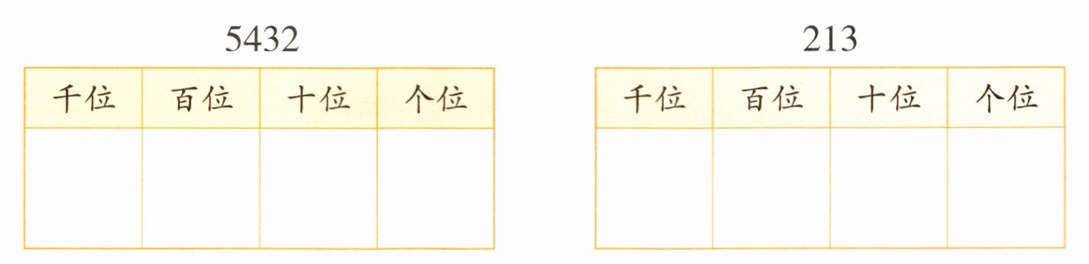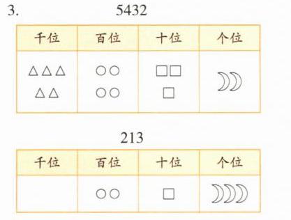 表示 1 个一,在数位表中画图形表示出 5432 和 213。
