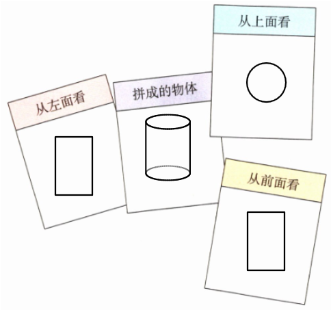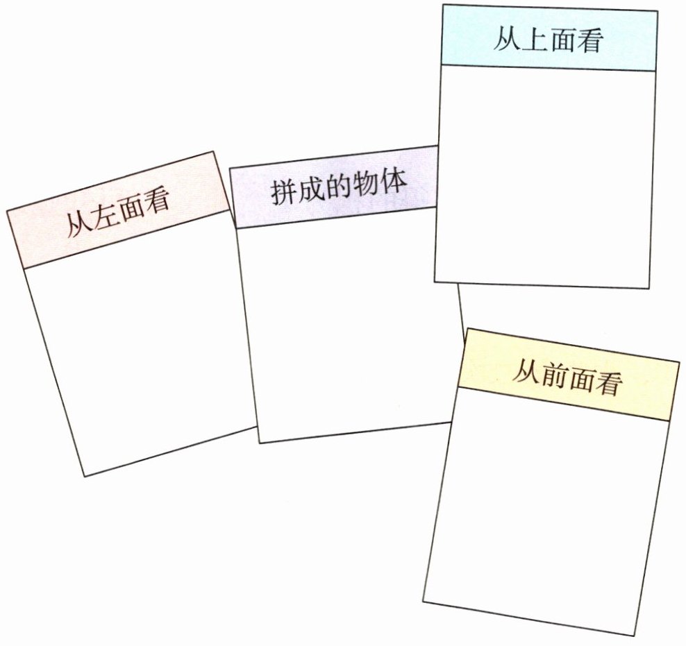 用家中的积木玩具拼一拼,摆一摆,将摆好后的物体从不同的方向观察一下,然后给它做一个小档案。试着将不同方向看到的图形画在下面吧!