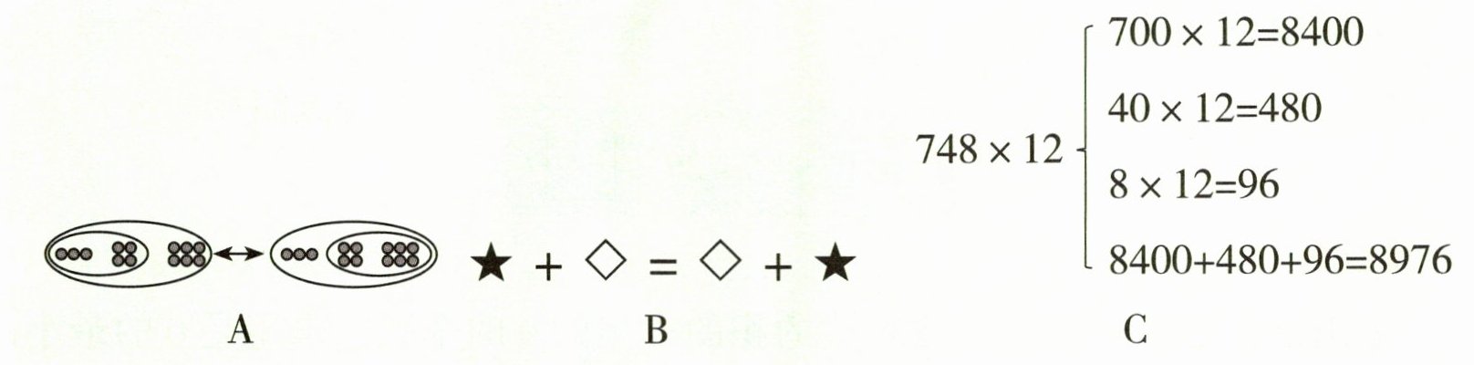 可以表示加法交换律的是(B),可以表示加法结合律的是(A),可以表示乘法分配律的是(C)。