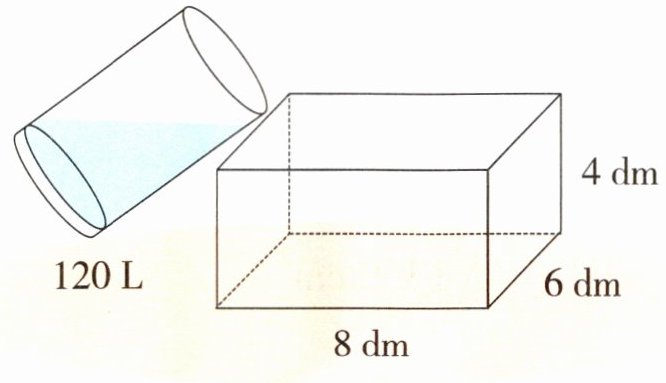 例2 把120L水倒入一个长8dm、宽6dm、高4dm的长方体玻璃缸中(玻璃厚度忽略不计)。这时玻璃缸中的水深是多少分米?