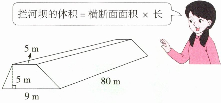 对于“长方体(或正方体)的体积= 底面积×高”的理解,不要拘泥于“下底面积×高”,实际上长方体或正方体任意一个面的面积与垂直于这个面的棱的长度相乘都可以求出它的体积。将此公式进行拓展延伸,可运用到本题中。根据题目信息“拦河坝的体积= 横断面面积×长”,先求出横断面的面积,即梯形的面积,然后再乘拦河坝的长即可求出体积,即土石的体积。