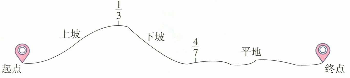 例2 王叔叔是一名自行车运动爱好者,周末经常去训练场进行训练。训练路线由三部分组成,从起点到全程的$\frac {1}{3}$处是上坡,从$\frac {1}{3}处到全程的\frac {4}{7}$处是下坡,其余的是平地,如下图所示。