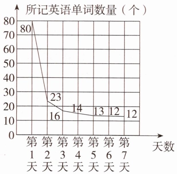 1. “艾宾浩斯遗忘曲线”告诉我们知识的遗忘是有规律的。乐乐做了一个实验:他第1天学习80个英语单词,在接下来的一周内每天都对这80个英语单词进行听写,由此得到了一组数据,绘制出如右下图所示的折线统计图。
