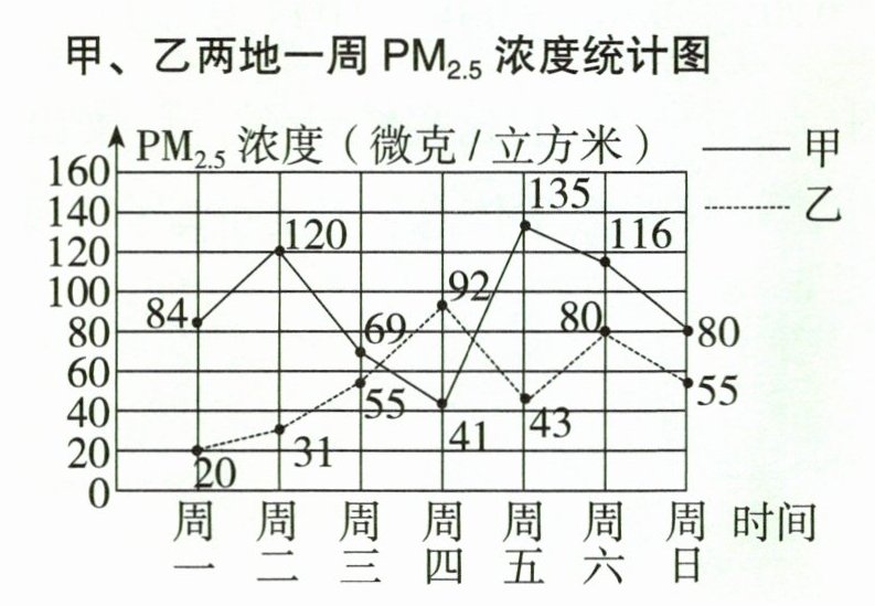 (2)PM_2._5浓度在0~35微克/立方米时空气质量为优,乙地周一、周二这两天的空气质量为优;PM_2._5浓度在116~150微克/立方米时空气质量为中度污染,甲地周二、周五、周六这三天空气质量为中度污染。