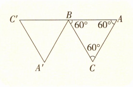 如下图,在三角形ABC中,已知∠A= ∠CBA= ∠C= 60°。把三角形ABC绕点B按顺时针方向旋转一个角度后得到三角形A'BC',∠C'BA= 180°。三角形ABC绕点B顺时针旋转了