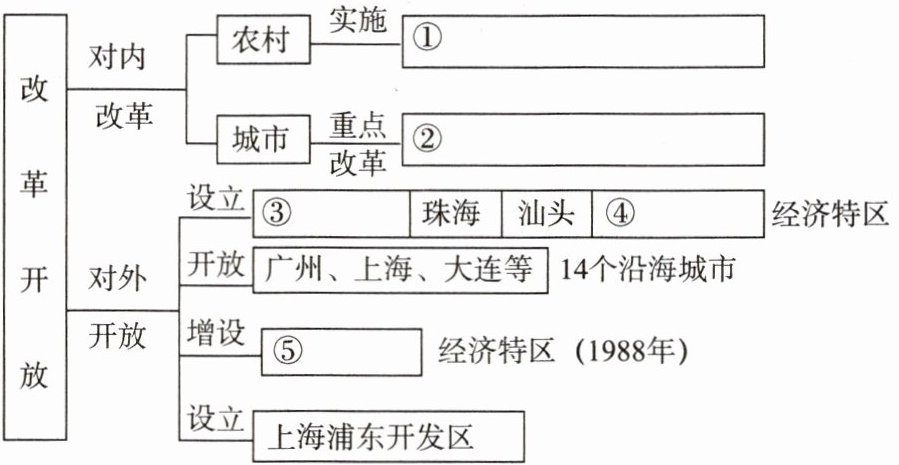 (2)①家庭联产承包责任制;②国有企业,③深圳,④厦门,⑤海南。