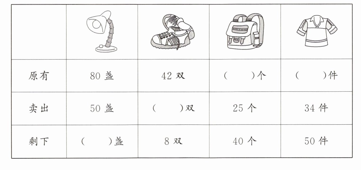 【解析】:根据“原有 - 卖出 = 剩下”“原有 = 卖出 + 剩下”“卖出 = 原有 - 剩下”进行计算。