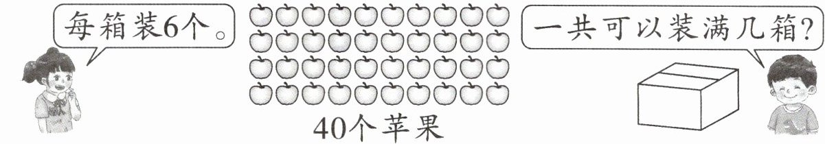 【解析】:从40个苹果中,每6个装一箱,就是求40里面有几个6。可以通过连续减去6的方法计算,40减去6得34,34减去6得28,28减去6得22,22减去6得16,16减去6得10,10减去6得4,此时剩下的4个不够装满一箱。一共减了6次,所以可以装满6箱。