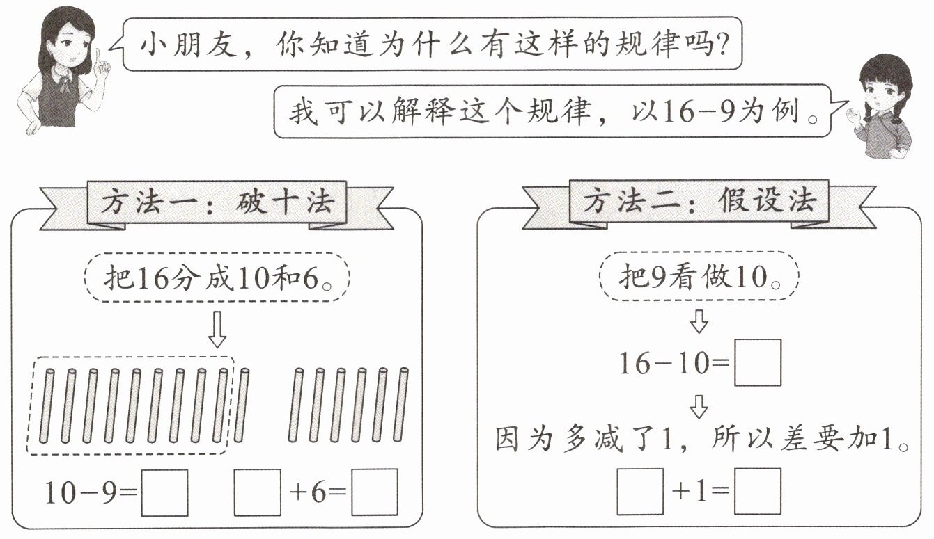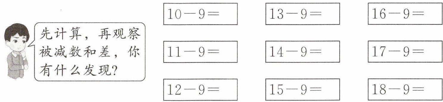 1.探究十几减9的差的规律。