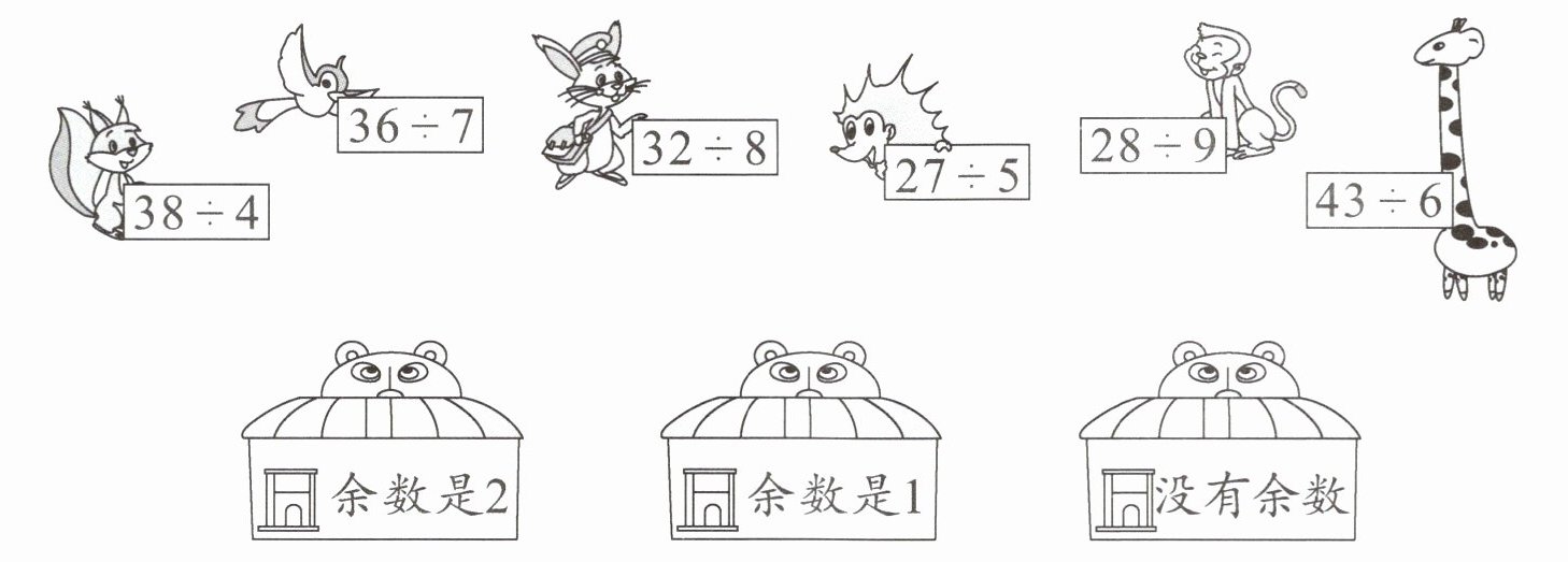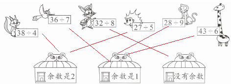 【答案】:38÷4—余数是2;36÷7—余数是1;32÷8—没有余数;27÷5—余数是2;28÷9—余数是1;43÷6—余数是1