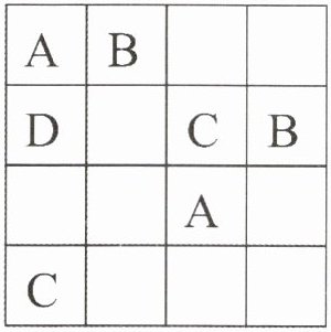2. 在下面的方格中,每行、每列都有A、B、C、D这四个字母,并且每个字母在每行、每列都只出现一次。你能将方格填完整吗?