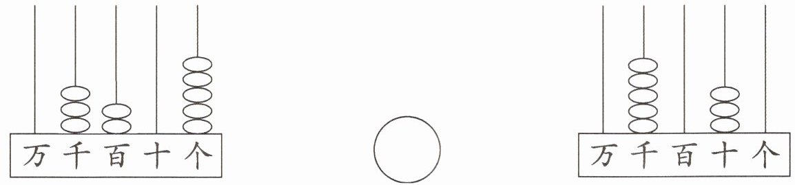 【解析】:写数时,从高位向低位依次写,哪一位上一个数也没有就在那一位写0占位。读数时从高位读起,中间有一个0或两个0都只读一个零,末尾的0不读。第一个计数器千位有3颗珠子、百位有2颗、十位0颗、个位5颗,写作3205,读作三千二百零五;第二个计数器千位5颗、十位3颗,百位和个位0颗,写作5030,读作五千零三十。比较大小,两数都是四位数,千位3<5,所以3205<5030。