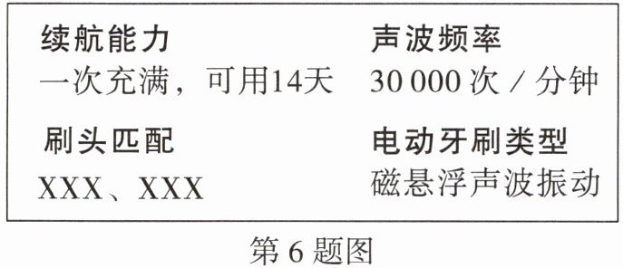 6. 如图所示为小明的电动牙刷参数,可以发现,他的牙刷工作时发出的声波 (选填"是"或"不是")超声波.电动牙刷发出的声波可以直达牙刷棕毛刷不到的地方,让牙齿清洁得更干净,这是因为声波具有 .