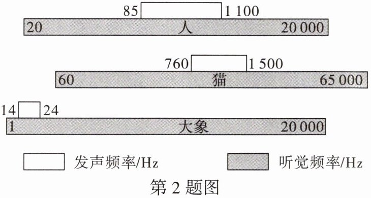 2. (教材图改编)如图所示是人和一些动物发声和听觉的频率范围. 既听不到次声波又听不到超声波, 能听到地震时发出的次声波.猫听不到 发出的声音.(均选填"人""猫"或"大象")