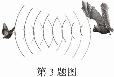 3. (教材正文改编)蝙蝠通常只在夜间出来活动、觅食,但它们不会撞到墙壁、树枝,并且能准确定位目标,是因为蝙蝠可以发出和听到 (选填"超声波"或"次声波");这种声波碰到墙壁或昆虫时会反射回来,如图所示,根据回声到来的方位和时间,蝙蝠就可以确定目标的位置,蝙蝠采用的方法叫作 ,这说明声音可以传递 .