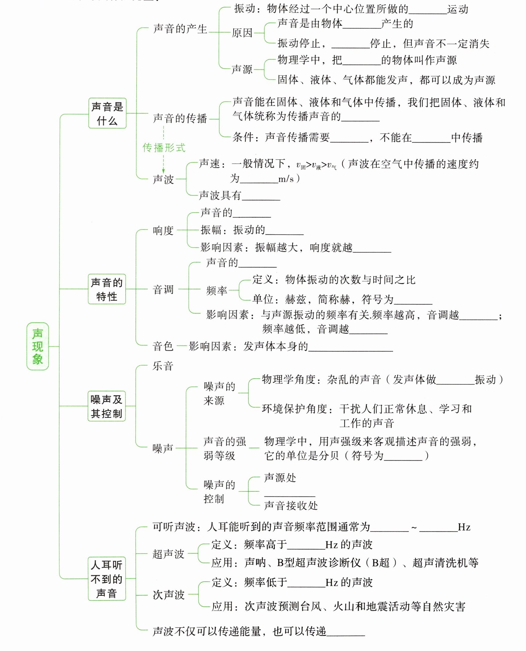 解:往复;振动;发声;正在发声;介质;介质;真空;340;能量;强弱;幅度;大;高低;Hz;高;低;材料和结构;无规则;dB;防止噪声产生;传播过程中减弱噪声;20;20000;20000;20;信息