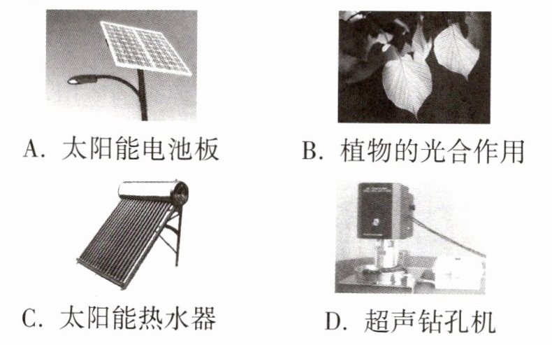 D 【解析】太阳能电池板将光能转化为电能,植物的光合作用将光能转化为化学能,太阳能热水器将光能转化为内能,A、B、C不符合题意;超声钻孔机利用的是声能,D符合题意.故选D.
