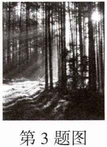 3. (教材图改编)如图所示,在有薄雾的天气,可以看到穿过树木间的空隙的光束是笔直的,说明光在空气中沿传播,地面上较暗的阴影是光在传播过程中遇到(选填"透明"或"不透明")的树冠,从而形成的影子.