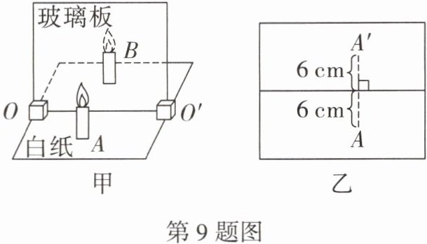 9. 一题多设问 小明利用如图甲所示的装置进行“探究平面镜成像的特点”实验,实验提供的主要器材有:玻璃板、两支完全相同的蜡烛、刻度尺、白纸.