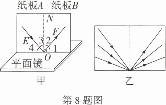 8. 一题多设问 实验小组的同学探究光的反射定律的实验装置如图甲所示,纸板 A、B 是用两块纸板连接起来的,且可绕 ON 折转.