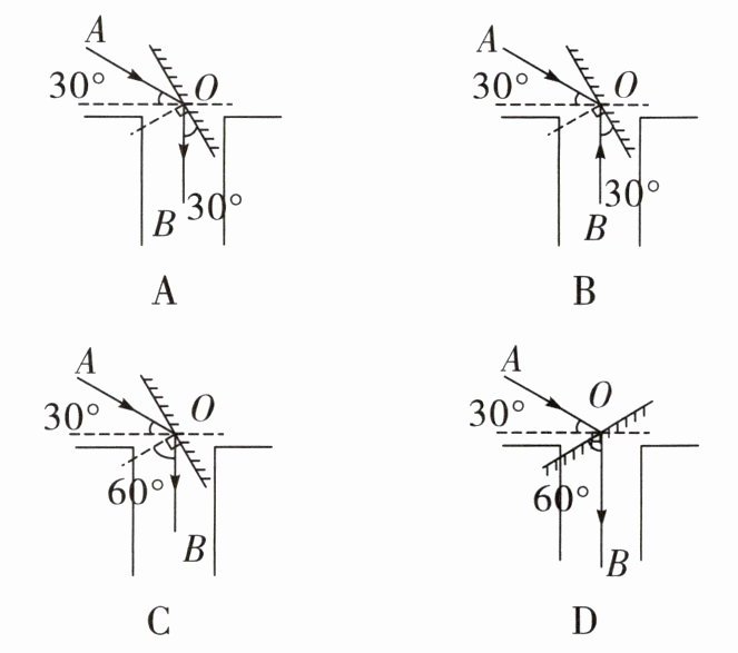 1. 一束光 AO 与水平面成 30°角,小明用一块平面镜使这束光竖直射入井中.下列能正确反映光路、平面镜位置及反射角大小的是 ( )