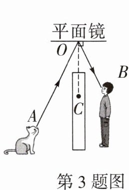3. (教材问题解决第 2 题改编)如图所示,小明通过一面镜子可以观察到墙壁后面的小猫,此时小猫也能看到小明,则小猫能够看到小明的光路中入射角为∠ (用字母表示).若∠AOC= 20°,则光线 AO 与光线 OB 的夹角为 °.