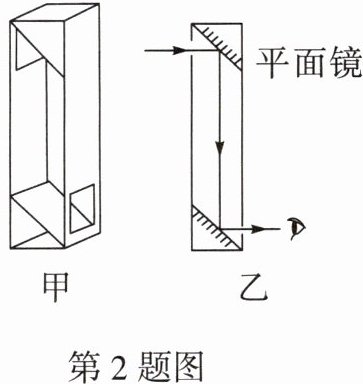 2. (教材练习第 2 题改编)如图甲所示,小明用硬纸板做成潜望镜镜筒,分别在其上下两端安装两块互相平行的平面镜,且平面镜与水平方向成 45°角,两平面镜镜面相对放置,图乙是其使用时的原理图.此潜望镜是利用光的 原理制成的,用潜望镜观察到的像是物体的 (选填“实”或“虚”)像.