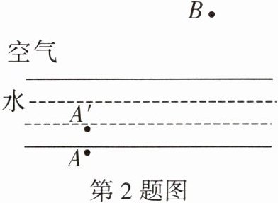2. 趋势情境 安全教育 老师在进行防溺水安全教育宣讲时常说,水的实际深度比看到的更深,提醒学生们不要到不熟悉的水域游泳.请在下图中画出人眼(用B点表示)看到水底A点变浅的光路图,A点的像用$A'$点表示.
