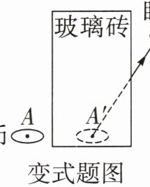 一块厚玻璃砖竖立在桌面上,小明站在玻璃砖右侧观察.将一枚硬币缓慢移至玻璃砖左侧某一位置时,小明发现硬币竟然“进入”了玻璃砖内部,如图所示,$A'$点是小明看到硬币上A点的像点.请补全小明眼睛看到硬币的光路图.