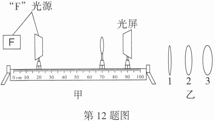 12. (教材活动改编)近视眼和远视眼需要佩戴不同类型的眼镜.为了探究近视眼和远视眼的矫正过程,小明组装如图甲所示的实验装置,其中"F"字样的光源代替可视物体,光屏模拟视网膜.