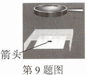 9. (教材练习第4题改编)小明把一滴水滴在玻璃板上,再拿一个放大镜放在水滴的上方模拟显微镜,如图所示.适当调节放大镜位置后,通过放大镜能看到一个清晰的像.下列说法正确的是 ( )