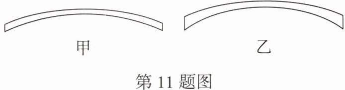 11. (教材读一读改编)小明讲到矫正视力缺陷时需要配眼镜,而眼镜的性能常用"度数"来反映,对于同样材质的镜片,随着度数的增加,镜片也会越来越厚.如图所示的两镜片矫正的都是 (选填"近视"或"远视")眼;两镜片的焦距分别为0.25 m、0.5 m,则甲镜片的度数应为 度.