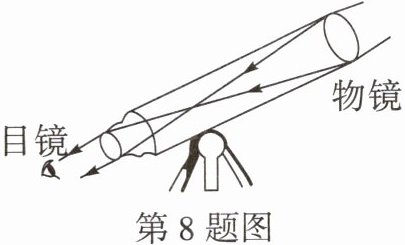 8. (教材图改编)如图所示是简易天文望远镜的内部结构示意图,远处的物体经过物镜成一个 、缩小的实像,目镜的作用像一个普通放大镜,以物镜成的实像为物,成一个正立、 的虚像.