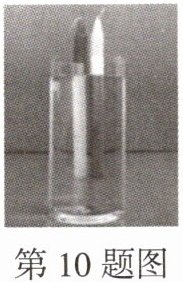 10. (黑白卷改编)小明先将两根外形完全相同但颜色不同的蜡烛并排竖直立在一个透明空水杯后,再向水杯中注入清水,适当调整水杯到蜡烛的距离,透过水杯观察可以发现两根蜡烛下半身刚好"互换",如图所示.下列说法正确的是 ( )