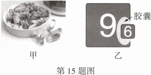 15. (黑白卷改编)如图甲所示为小明妈妈常吃的某品牌鱼油胶囊,该鱼油胶囊呈透明的水滴状.如图乙所示,小明透过鱼油胶囊观察积木,发现上面的数字“9”变成了“6”,下列有关说法中正确的是( )