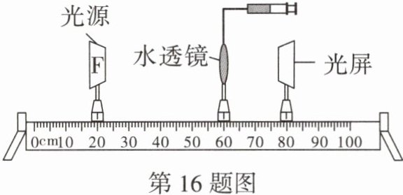 16. 小明用透明橡皮膜制作了一个水透镜,利用注射器向水透镜内注水或向外抽水可改变水透镜的焦距,来模拟人眼视物原理的探究,装置如图所示,此时发光板字母“F”恰好在光屏上成清晰的像(图中未画出).下列说法正确的是( )
