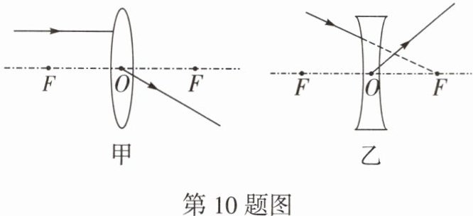 10. 如图是两条光线分别通过凸透镜、凹透镜后的部分光路图,O 点为透镜的光心,F 为透镜的焦点,请在图中分别画出两条光线的完整光路.