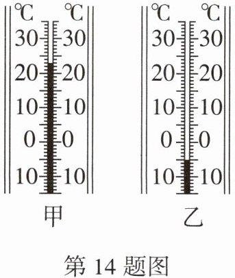 14. “早穿皮袄午穿纱,围着火炉吃西瓜”描述了我国新疆地区昼夜温差大的现象.如图所示是新疆某地区十月份的某一天中,气温最高和最低时寒暑表的示数,由图甲、乙可知当日的最大温差为______℃.夜晚,小明想使用酒精温度计测量室外环境温度,为了方便观察,他将温度计拿到自己卧室,则小明测量出的夜晚温度______(选填“准确”或“不准确”).