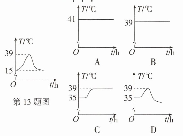 13. 学完“温度”后,几位同学分别将一支普通温度计和水银体温计放在教室窗台,记录从早到晚温度计示数T随时间t变化的图像,普通温度计对应的图像如图所示.下列体温计记录的图像中一定不可能的是 ( )