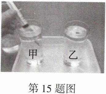 15. (中考新考法·演绎推理)小聪在两个相同杯子中加入等量的冷水和热水,再取两个相同的注射器将其活塞抽动,使注射器管内留一定的空间并将注射器口堵紧,然后将两个注射器分别放入准备好的两杯水中,如图所示,会发现甲杯中注射器活塞向上运动,乙杯中注射器活塞基本无变化,则______(选填“甲”或“乙”)杯中是热水,你判断的理由是:______.