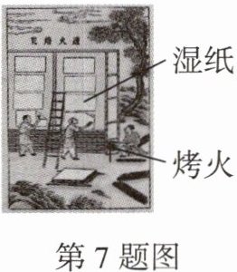 7. 趋势情境 传统文化·科学典籍 如图所示是《天工开物》中记载造纸的一道工序,名为"透火焙干",将刚生产出来的湿纸张开贴在烤火的墙上,从而使纸张变干. 下列说法正确的是( )