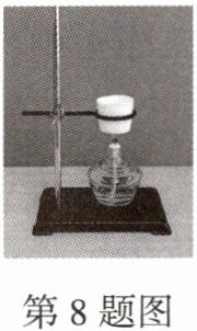 8. (教材练习第2题改编)如图所示是小万做的"纸锅烧水"实验. 她将适量的水装入"纸锅"后,用酒精灯外焰加热,一会儿水沸腾了,但"纸锅"并没有燃烧,这是因为水沸腾时温度______,并且______(选填"低于"或"高于")纸的着火点,使用温度更高的火焰______(选填"能"或"不能")使"纸锅"燃烧.